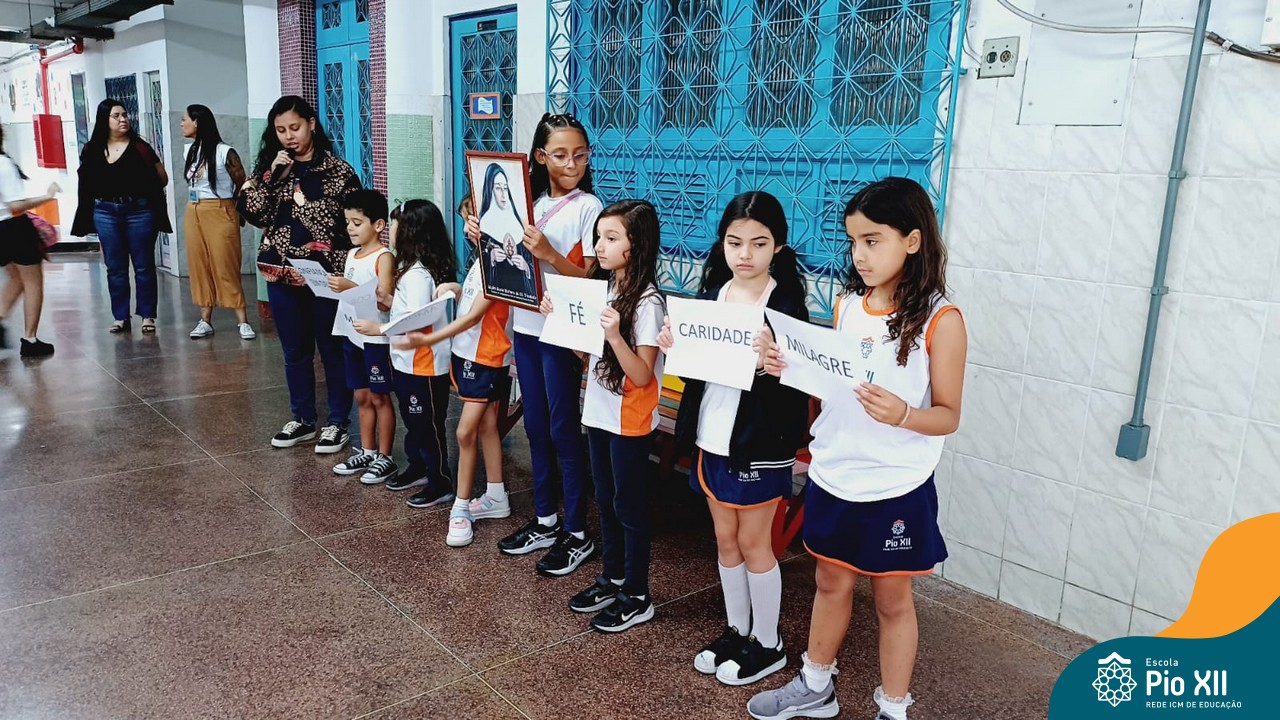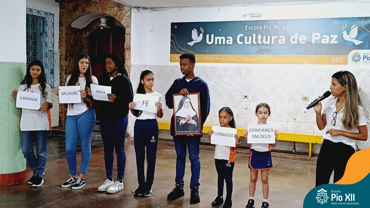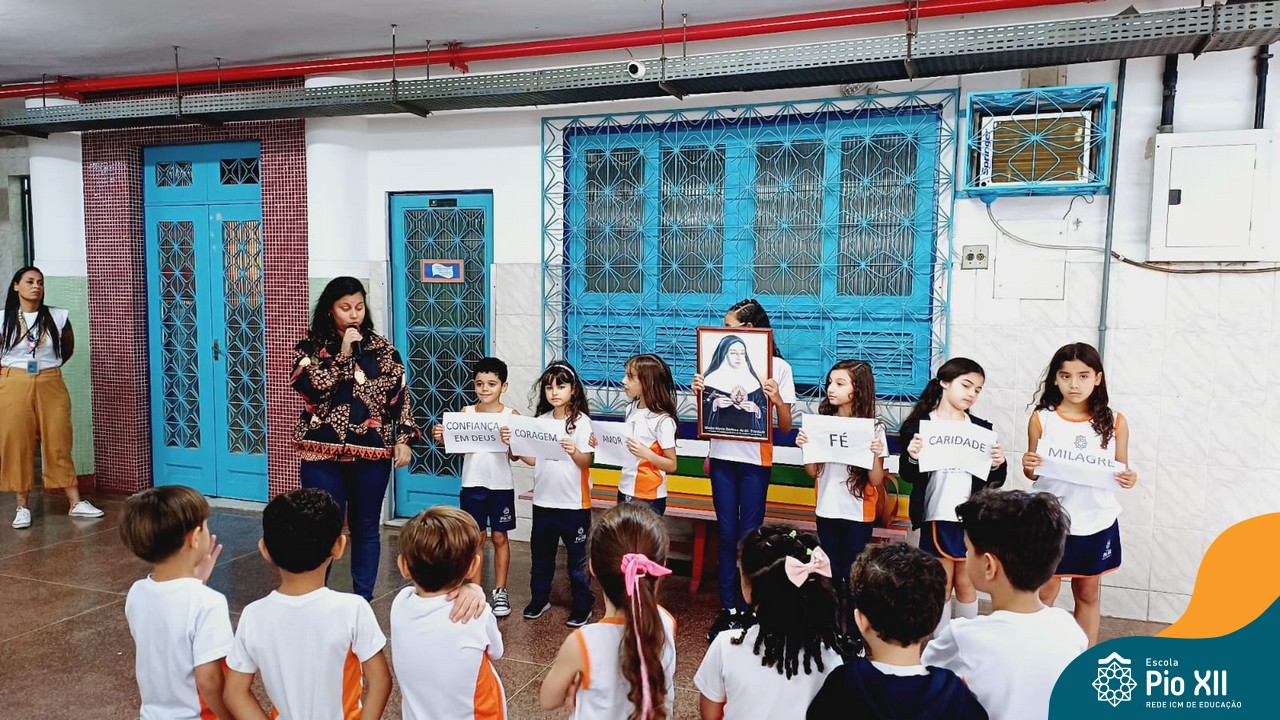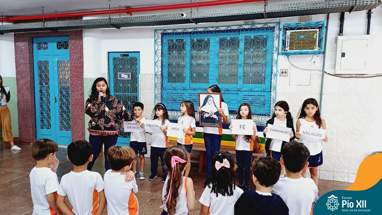 Em um momento de fé e comunhão, nossos alunos, do Maternal ao Ensino Médio, se reuniram no pátio da Escola Pio XII para celebrar a Memória Litúrgica da Beatificação da Bem-Aventurada Bárbara Maix.