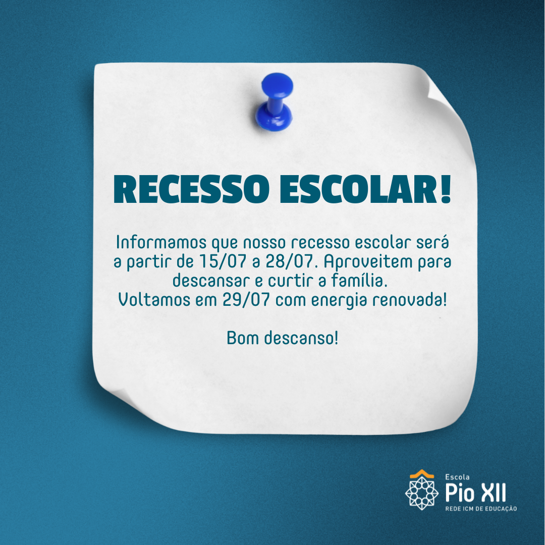 Queridas famílias e alunos, informamos que nosso recesso escolar será a partir de 15/07 a 28/07. Este é um momento precioso para descanso, reflexão e convivência familiar. Aproveitem esse período para renovar as energias e voltar com ainda mais entusiasmo!