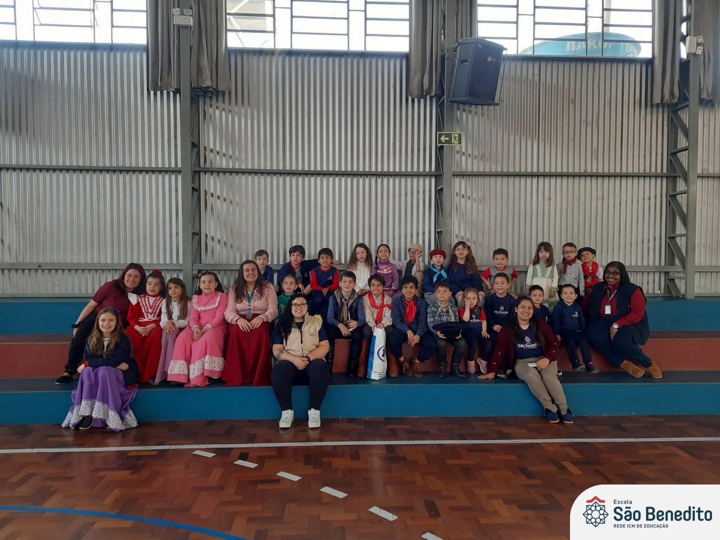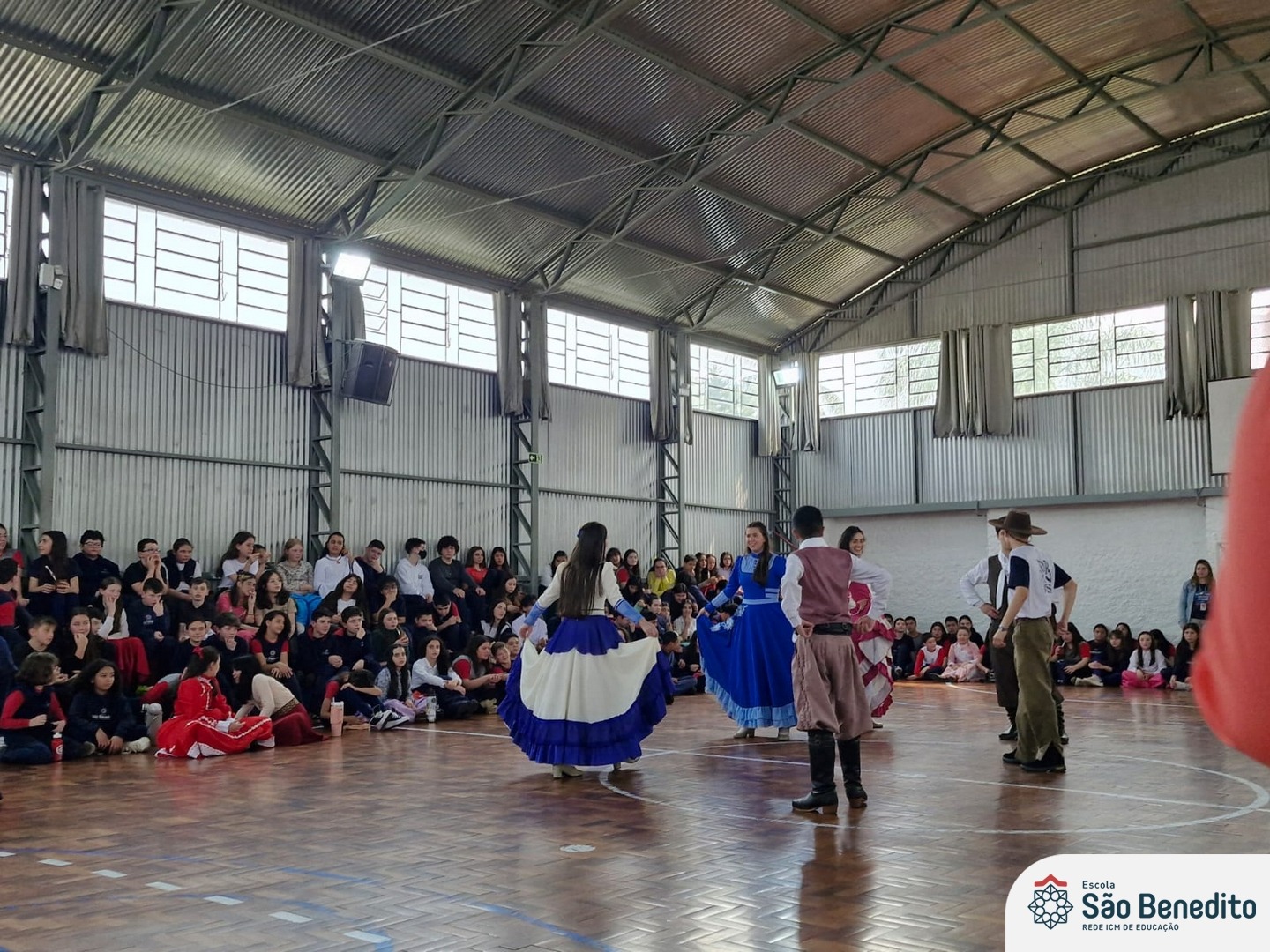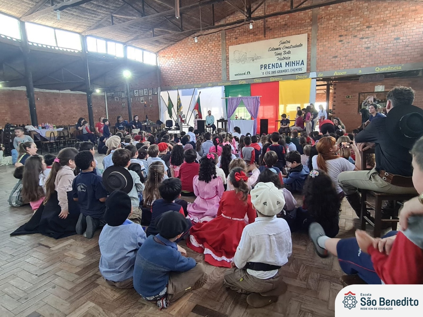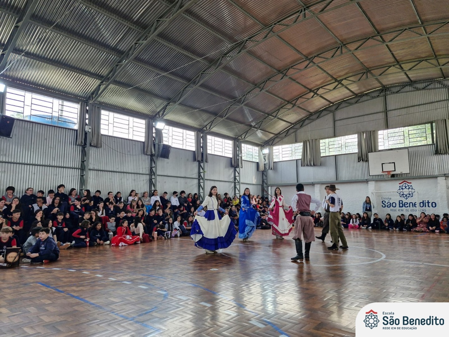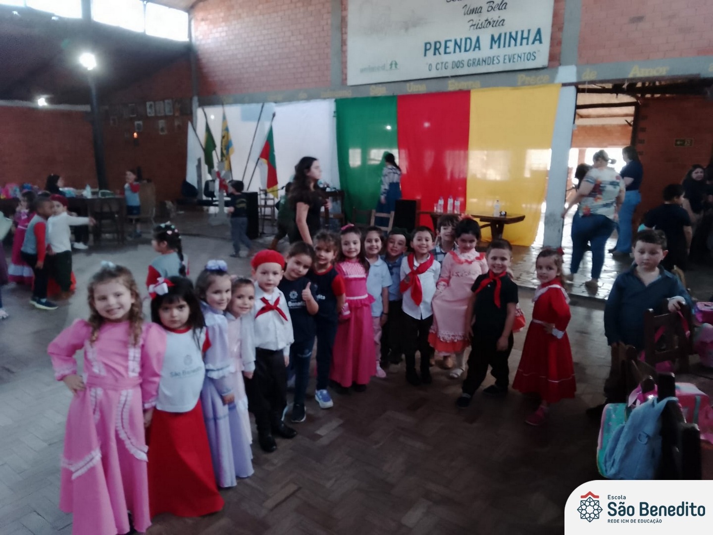 Durante a Semana Farroupilha, a Escola São Benedito celebrou com uma série de atividades tradicionalistas que envolveram toda a comunidade escolar. Houve apresentações de CTG, declamações, música e dança. Essas atividades proporcionaram um momento de confraternização e aprendizado sobre a cultura gaúcha, fortalecendo os laços entre os participantes e celebrando as tradições do Rio Grande do Sul.