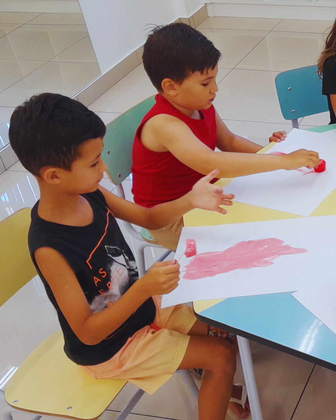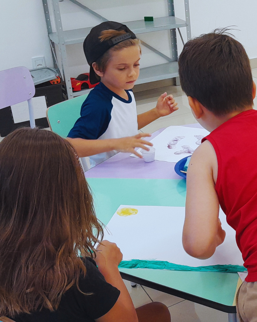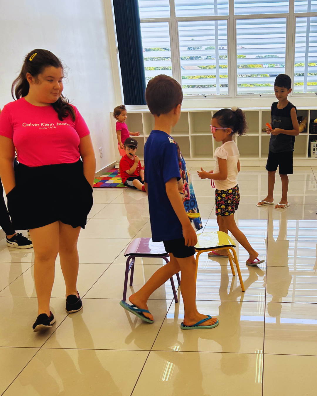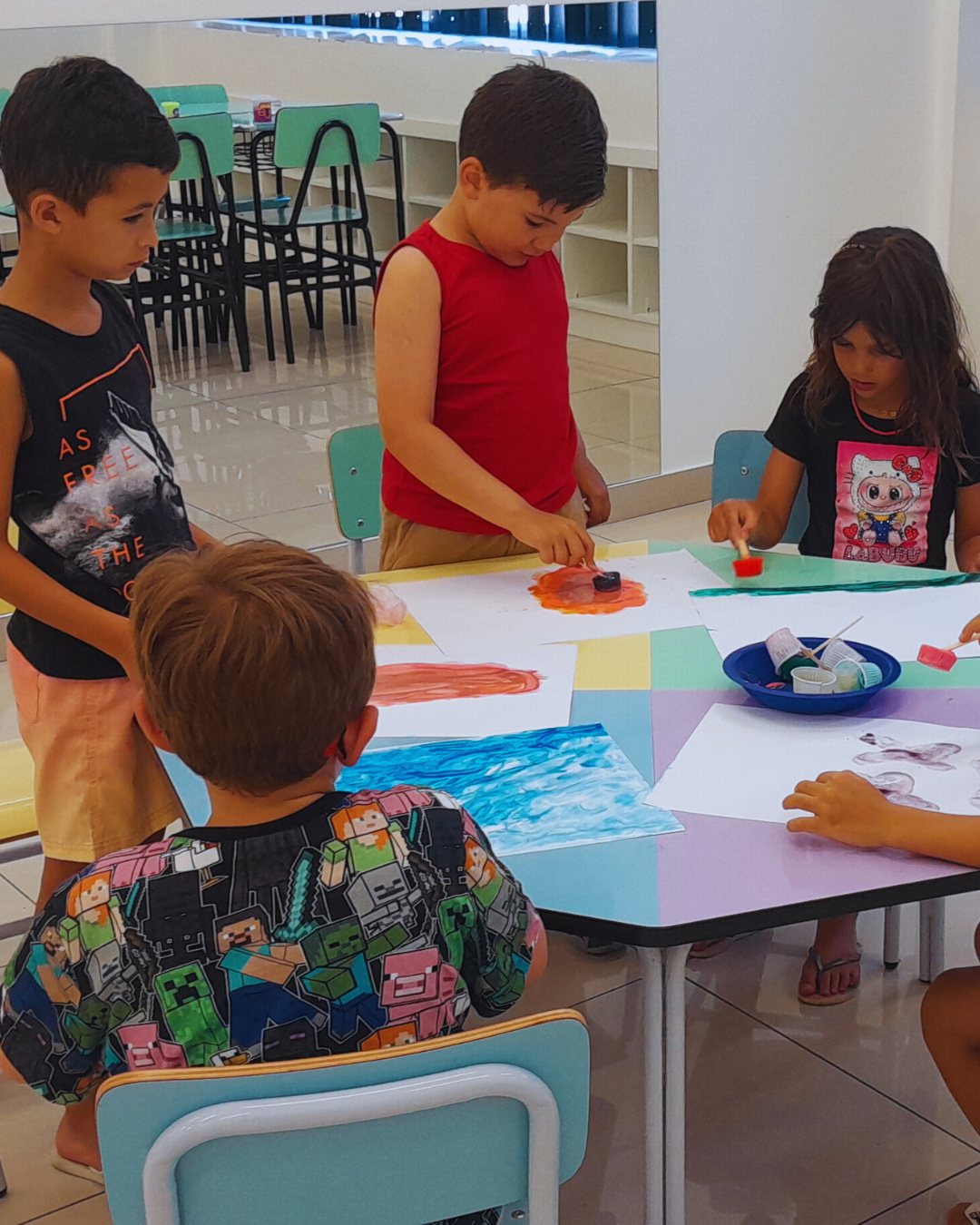 A programação também contemplou experiências de expressão e imaginação, com tarde dos penteados divertidos, tatuagem divertida, dança das cadeiras, oficina de barco de papel e corridas de barco na água. Cada atividade foi pensada com intencionalidade pedagógica, estimulando a convivência, o desenvolvimento motor, a criatividade e o bem-estar.