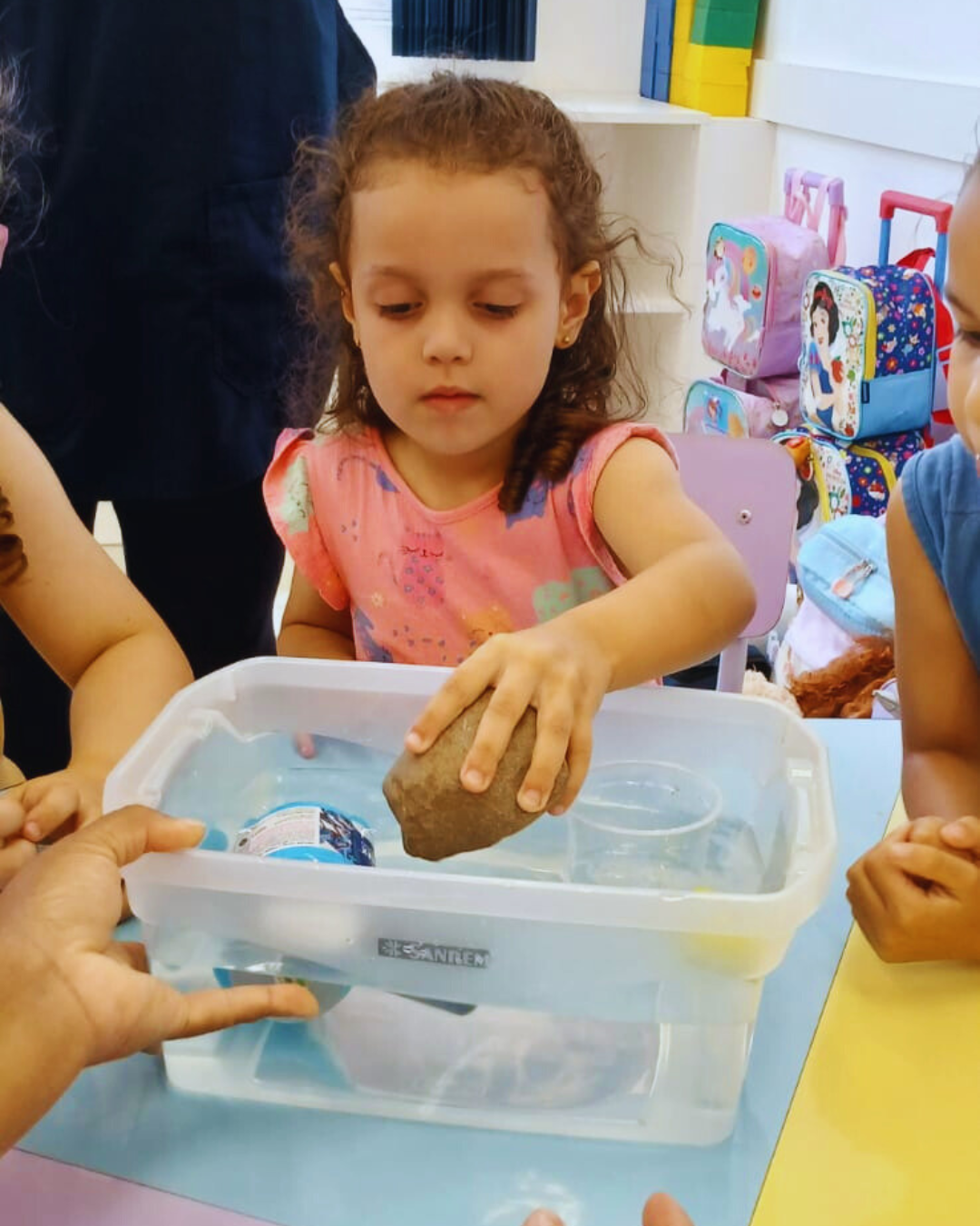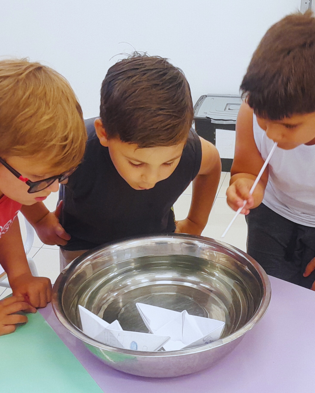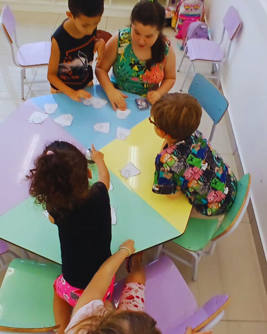 A programação também contemplou experiências de expressão e imaginação, com tarde dos penteados divertidos, tatuagem divertida, dança das cadeiras, oficina de barco de papel e corridas de barco na água. Cada atividade foi pensada com intencionalidade pedagógica, estimulando a convivência, o desenvolvimento motor, a criatividade e o bem-estar.