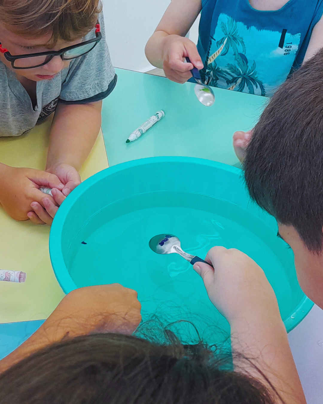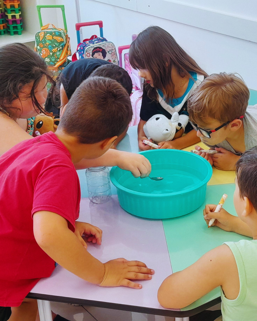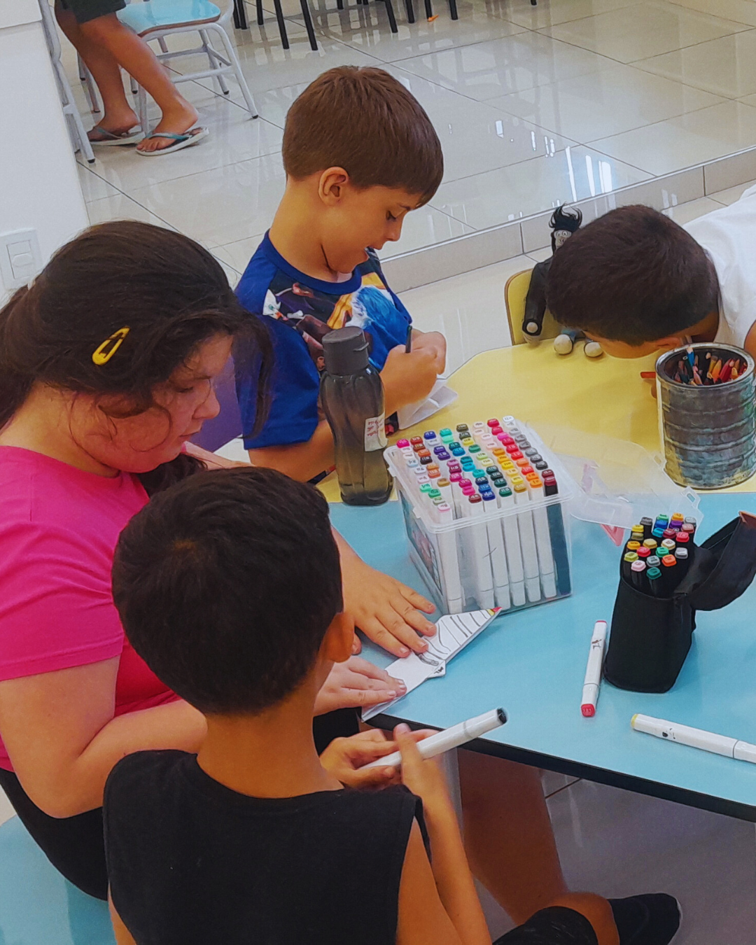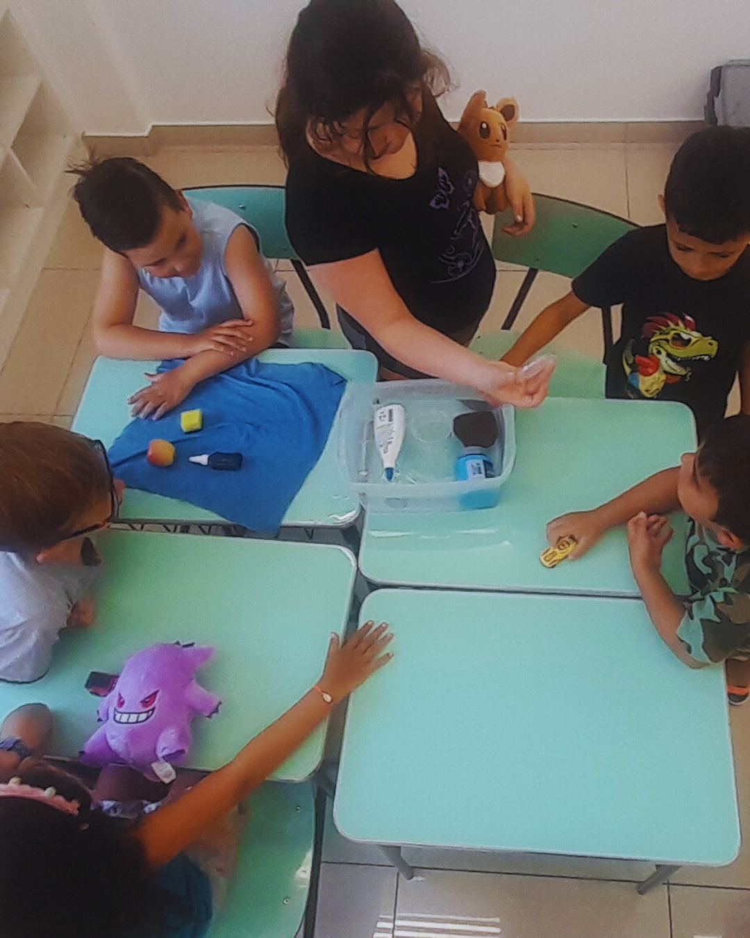 A programação também contemplou experiências de expressão e imaginação, com tarde dos penteados divertidos, tatuagem divertida, dança das cadeiras, oficina de barco de papel e corridas de barco na água. Cada atividade foi pensada com intencionalidade pedagógica, estimulando a convivência, o desenvolvimento motor, a criatividade e o bem-estar.