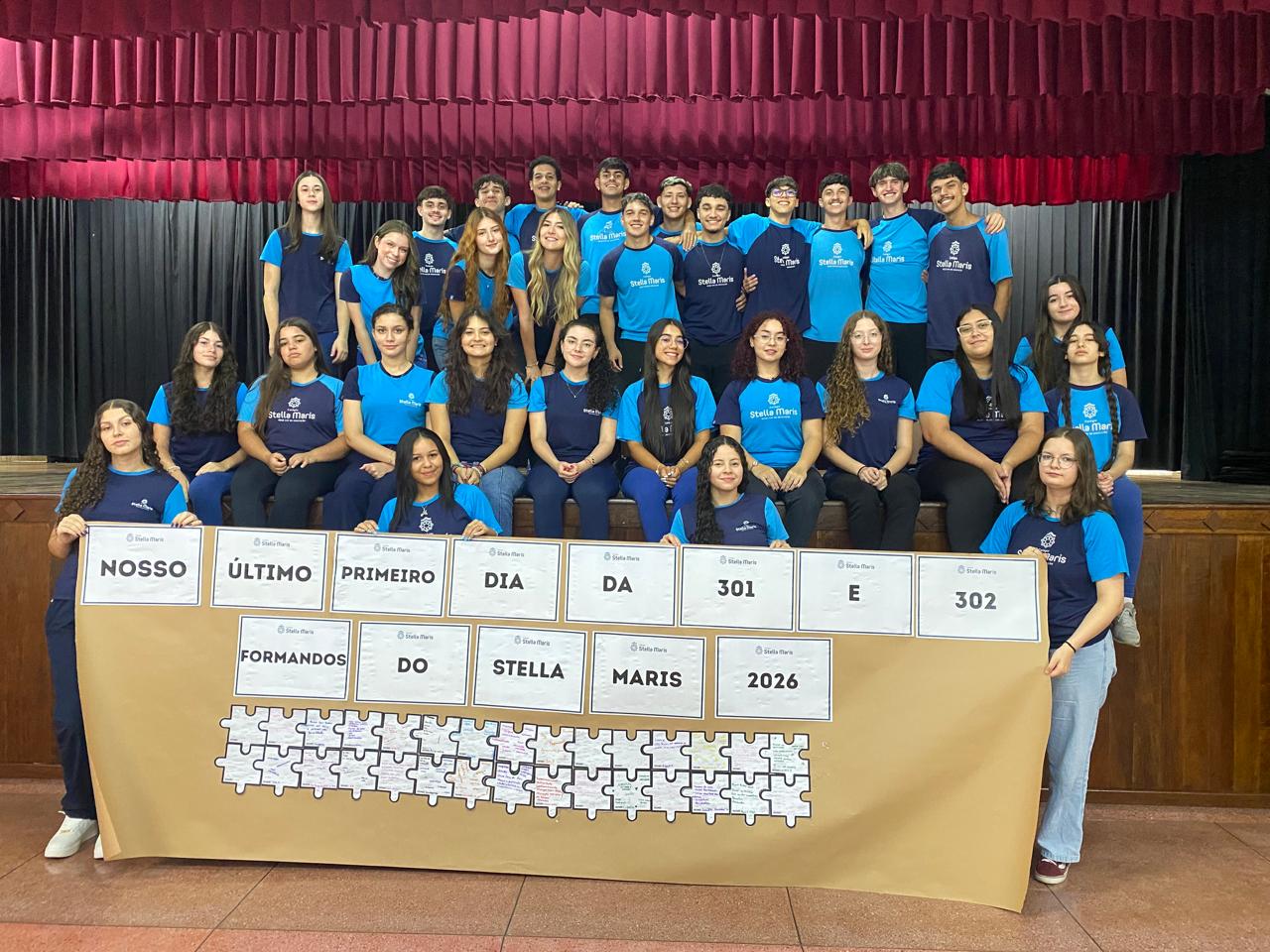 Já com as turmas 301 e 302, foi realizado o tradicional “Último Primeiro Dia de Aula” do Terceirão, um momento simbólico e profundamente significativo. A atividade marcou o início do último ano da Educação Básica, etapa que representa a consolidação de aprendizados e a preparação para novos projetos de vida. Em clima de acolhida e compromisso, os estudantes foram convidados a refletir sobre dedicação, perseverança e responsabilidade diante dos desafios que se aproximam.