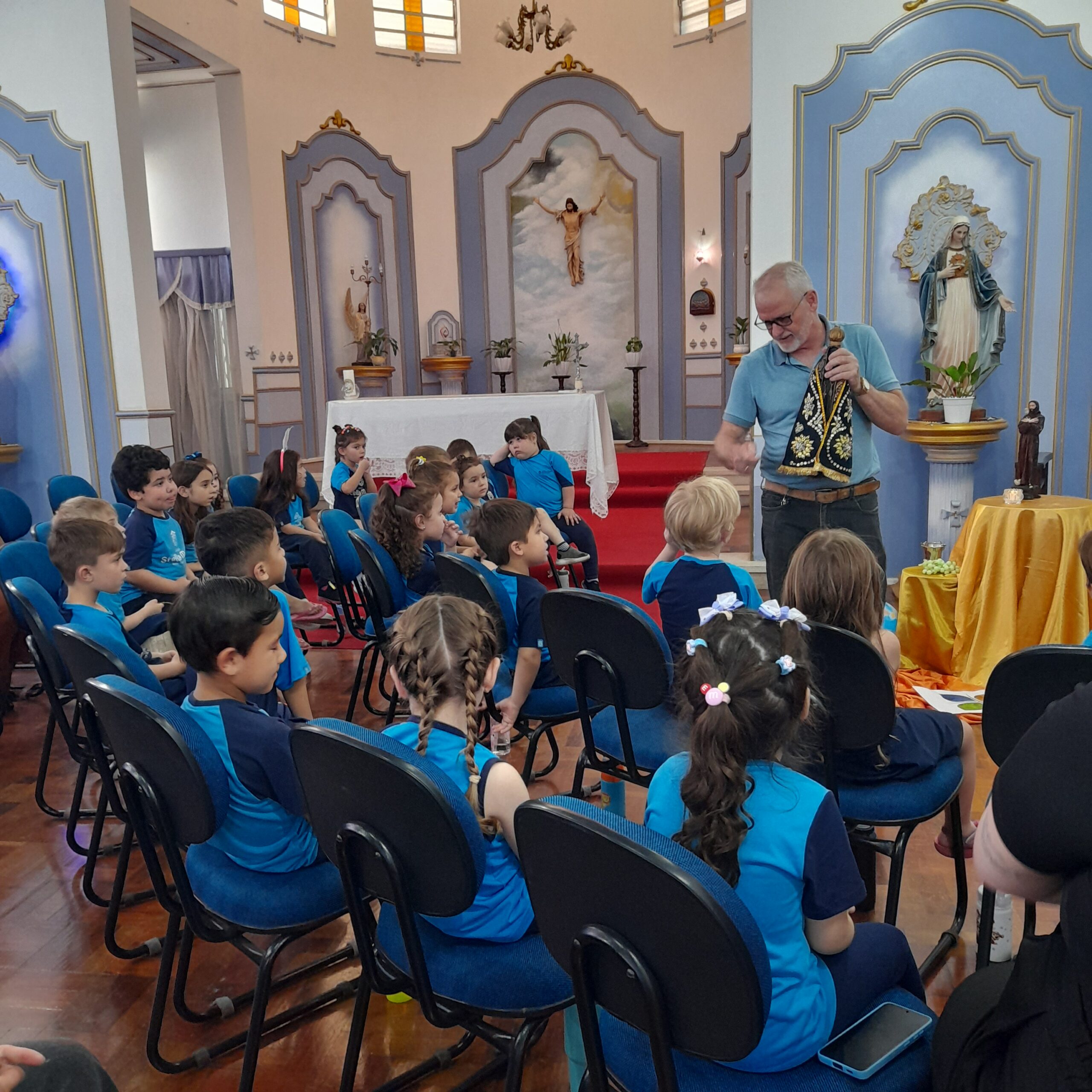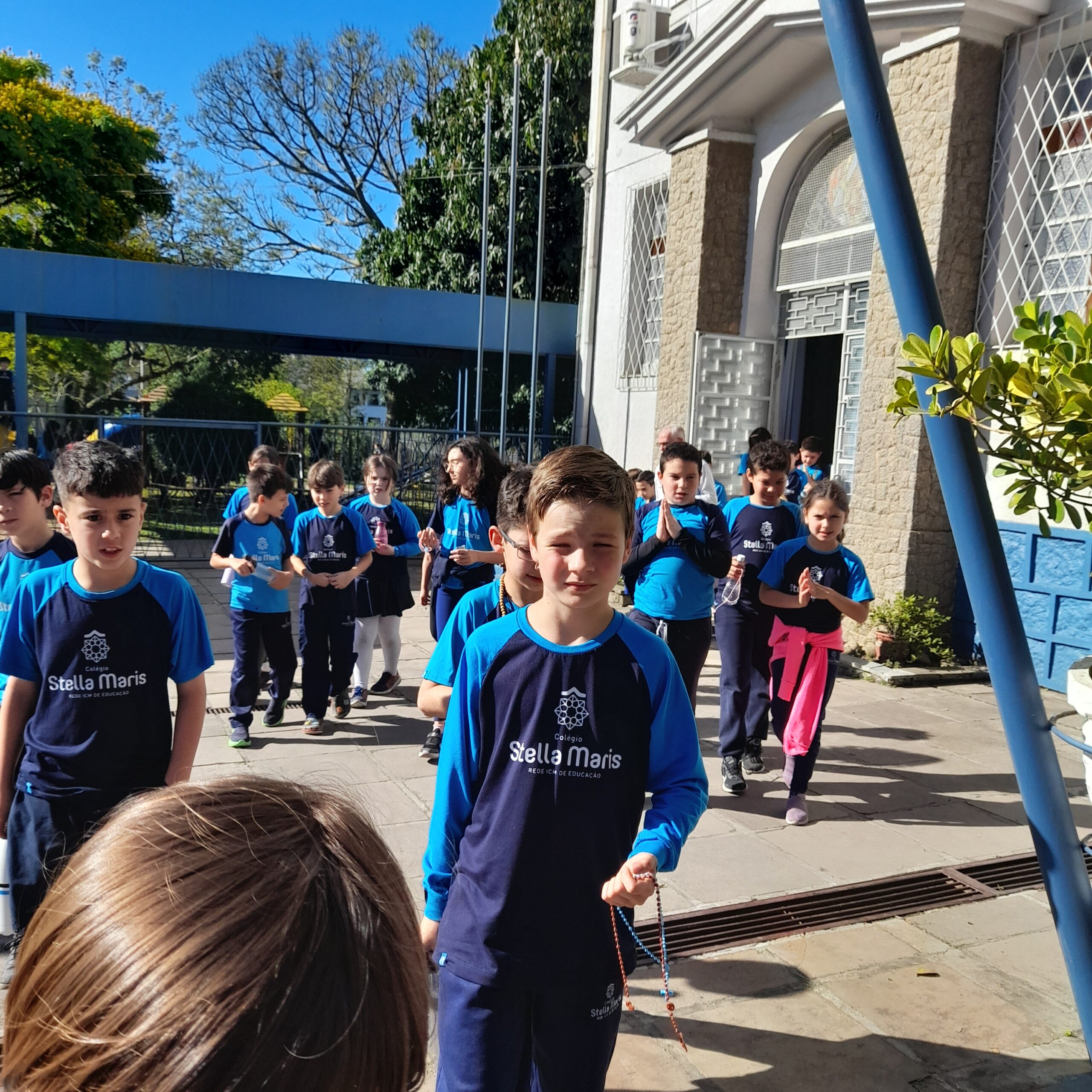 Reunidos na Capela e na Gruta de Nossa Senhora de Lourdes, os estudantes vivenciaram momentos de fé e ternura ao aprender o significado do terço e a utilizá-lo como instrumento de oração, descobrindo, a cada conta, um caminho de encontro com Maria e com Jesus.