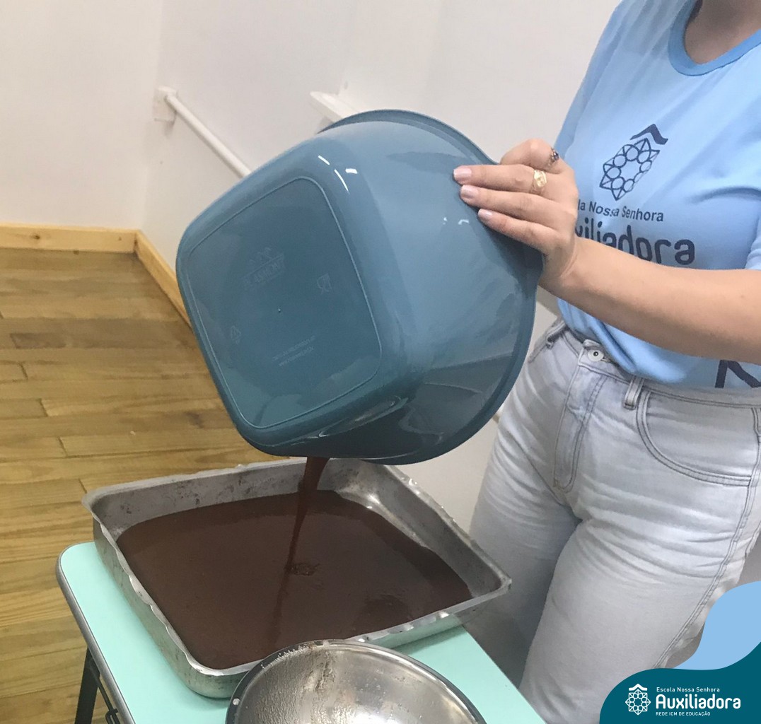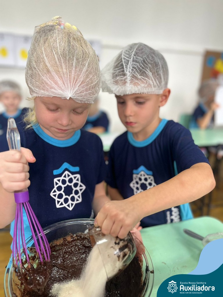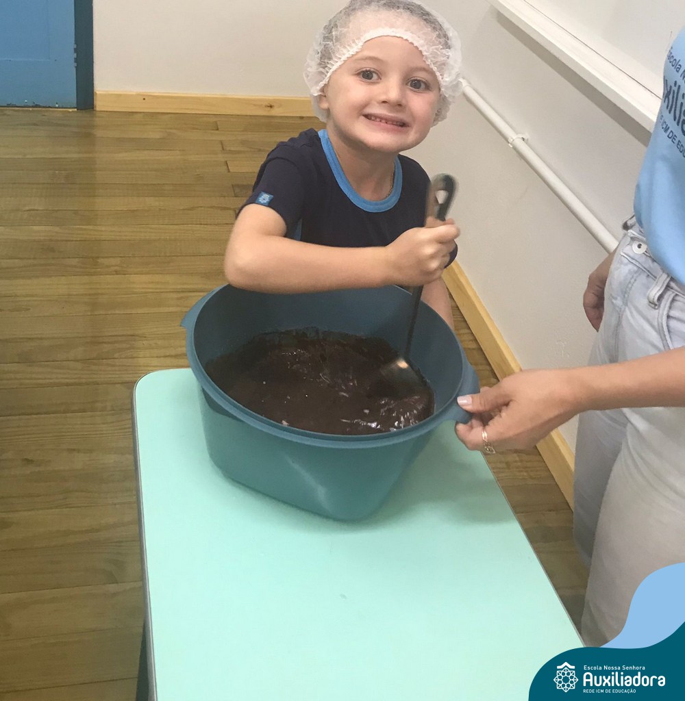 Em clima de Páscoa e confraternização, as crianças se envolveram em uma experiência de culinária muito significativa, fazendo um delicioso bolo de Cacau! Esta atividade não só ensina habilidades culinárias básicas, como também promove a criatividade e a colaboração. Realizaram a exploração sobre o Cacau, a separação e mistura dos ingredientes e, por fim o registro da receita em folha. Cada etapa foi uma oportunidade para aprender e se divertir juntos. Além disso, o resultado final foi um saboroso bolo, uma recompensa que todos puderam desfrutar em um lanche compartilhado, afinal Páscoa é partilha, amor e carinho uns com os outros.
